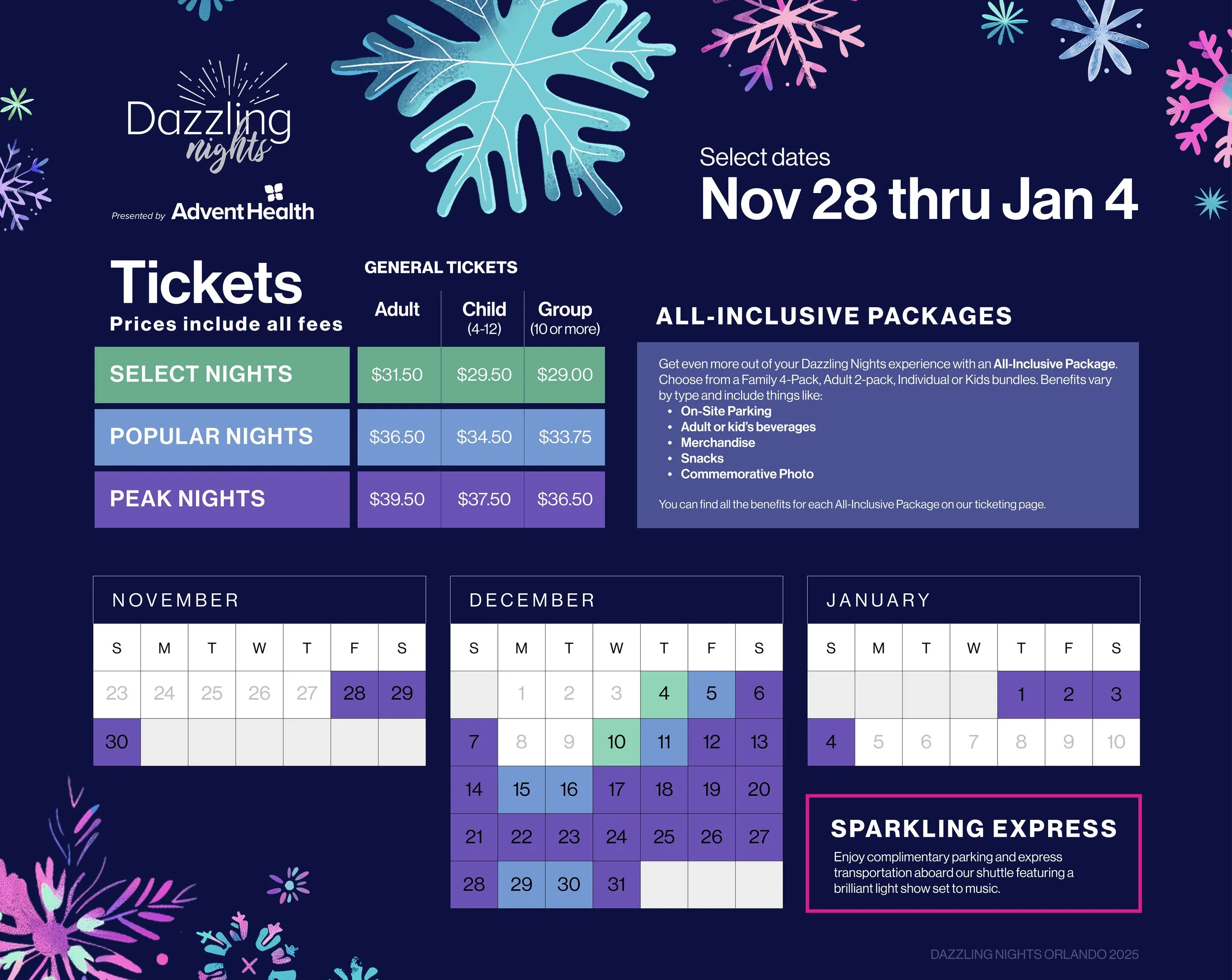 COMPLIMENTARY OFF-SITE PARKING ADDRESS w/ADA Shuttle (no parking pass needed): Your Dazzling Nights experience begins aboard the Sparkling Express - our complementary shuttle with a magical light show.